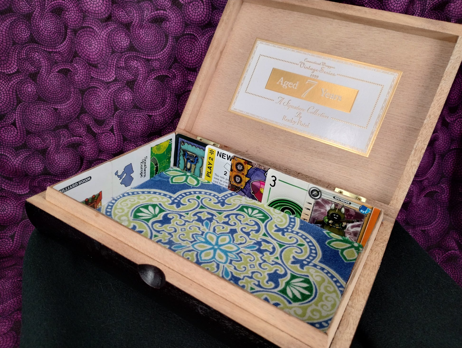 Wooden cigar box, black, lined with cloth, and game cards under acrylic finish for durability.